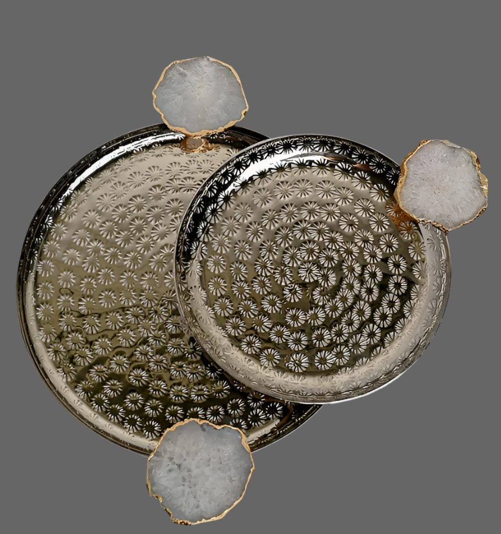 Set of two round hand made Trays - Medium and Small sizes with white handles